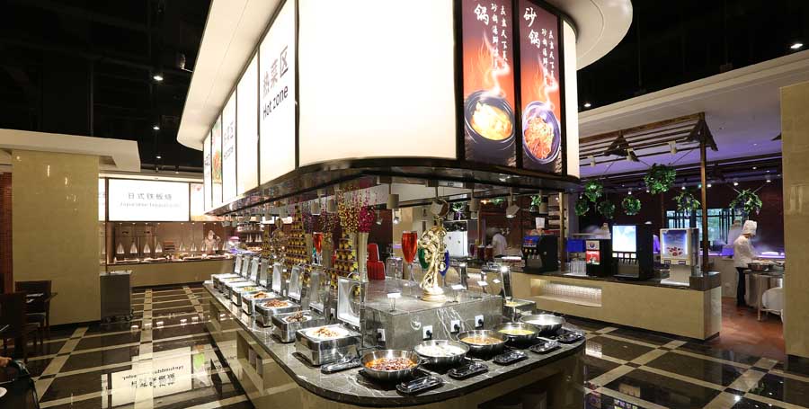 蓝钻国际美食自助百汇位于饭店一楼,共210个餐位。菜品以现场制作为特色,中西结合、适合不同年龄段人群就餐,170余种美食任您享用,其中特色档口有烧烤区、铁板烧区、中华料理区等,是家庭聚餐和朋友聚会的最佳场所。